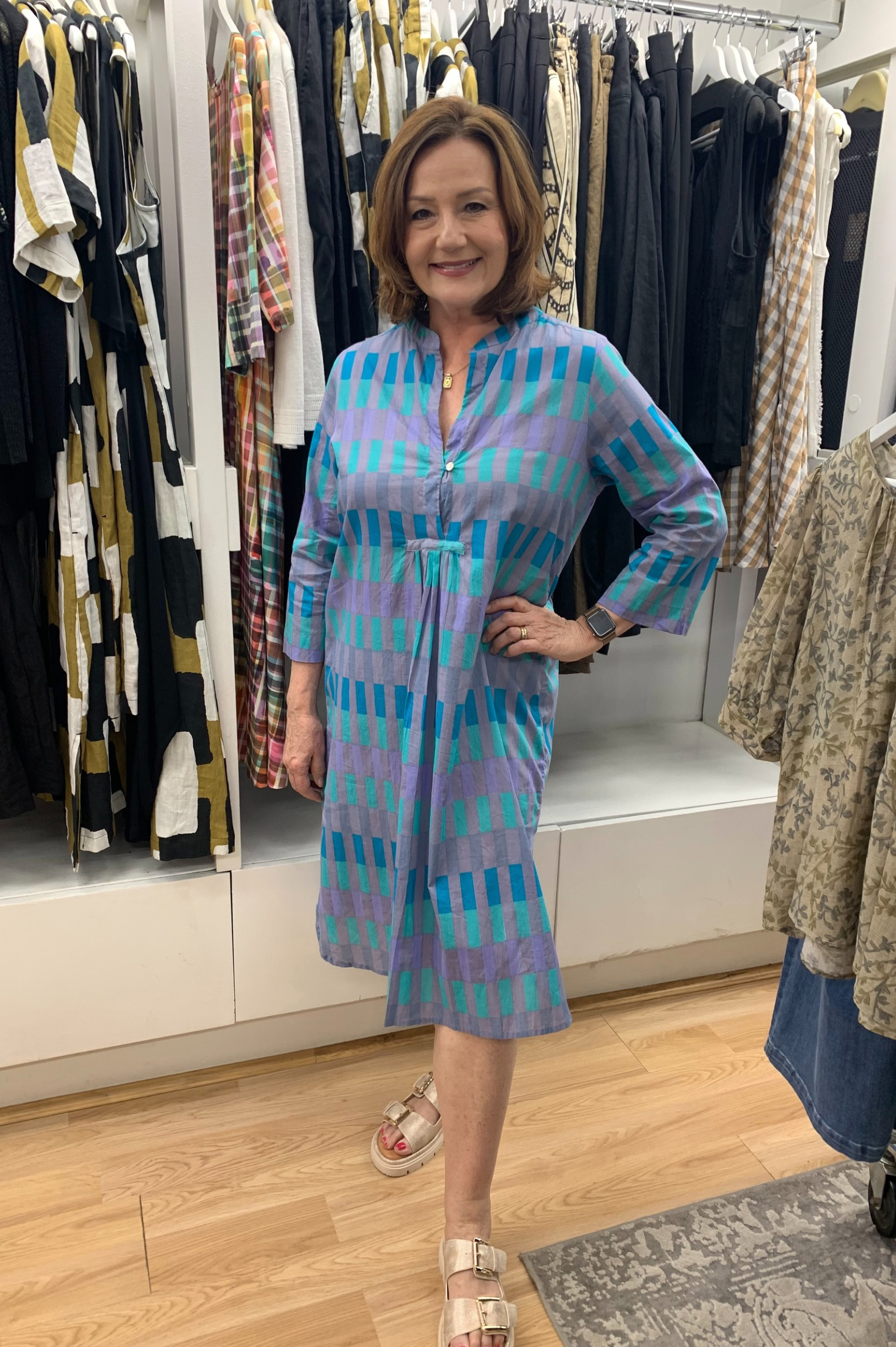 A relaxed fit makes the Seasonal dress the perfect summer dress, featuring a mandarin collar, 3/4 sleeves, button closure through the chest, and gathered detailing through the waist giving a lovely feminine shape. Paired back with sandals or a fashion sneaker and you're ready to go!