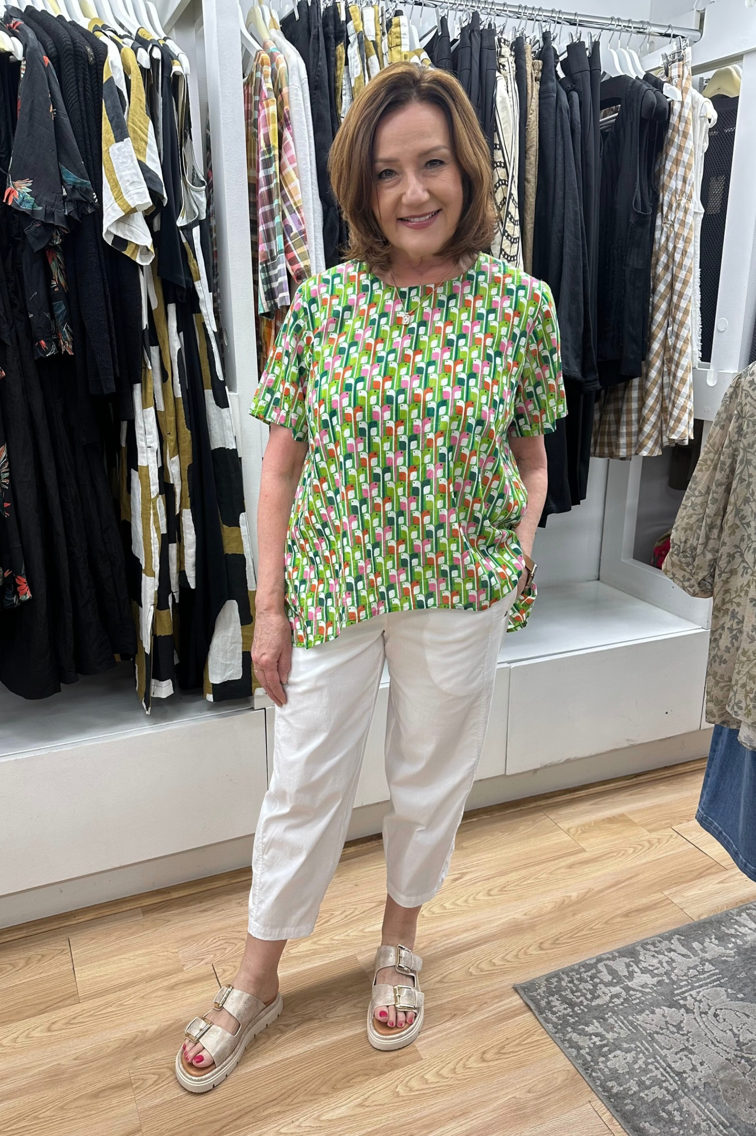 Indulge in the vibrant colours of the CAKE Zimmi top in Birdie made from 100% pure cotton. Its comfortable short sleeves and round neckline make it perfect for any occasion. The shell button closure with split at the back adds a touch of elegance, while the front hem being shorter accentuates your figure.