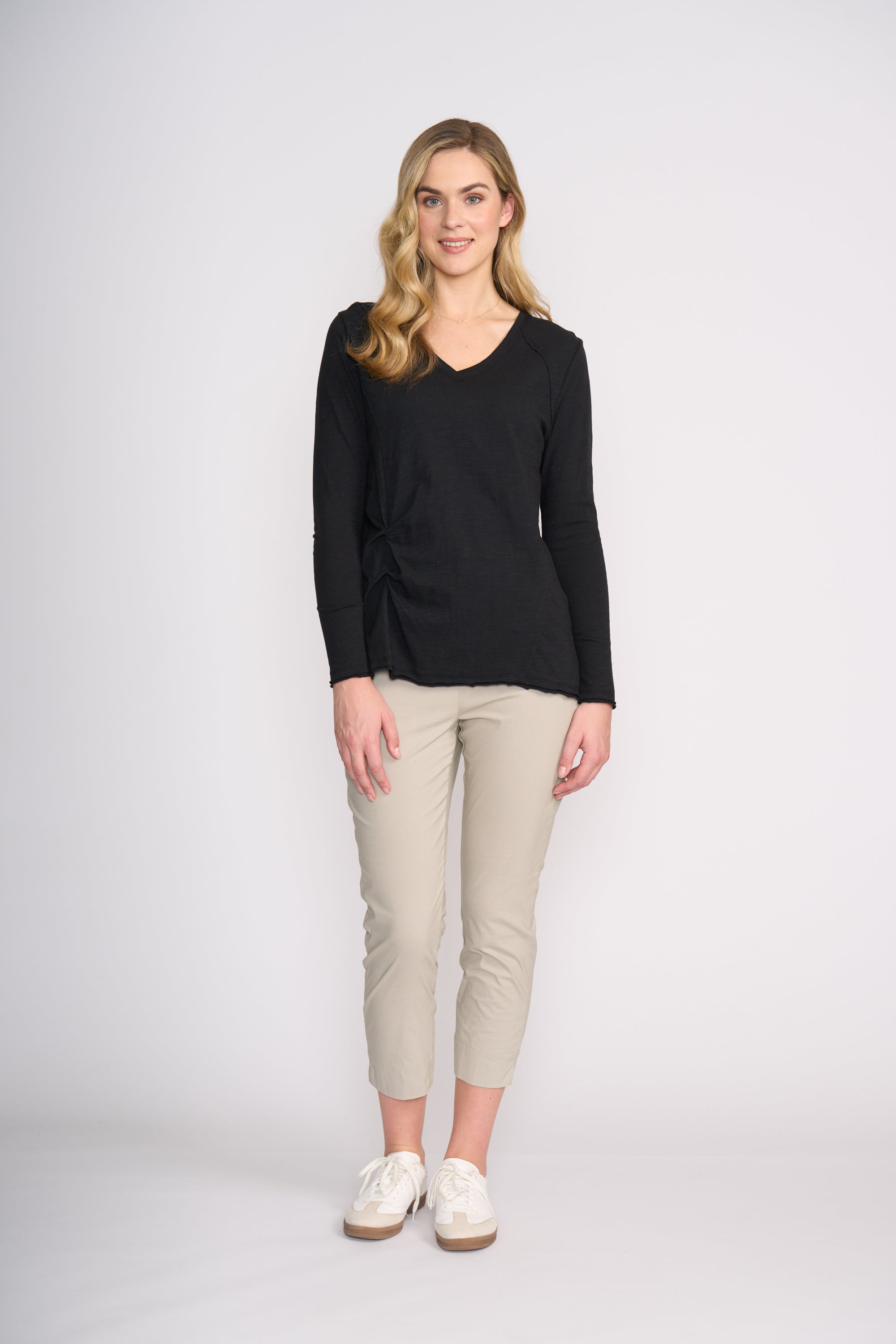 Embrace effortless style with the Fuss Free 7/8 Taper Capri by Foil, destined to be your go-to this summer. These pull-on pants are crafted from a luxurious, lightweight stretch cotton blend that feels delicate and airy against your skin. Perfect for casual outings, the plain colours effortlessly complements tunics, kaftans, tees, and blouses alike, making them a versatile addition to your wardrobe. With a comfortable waistband and slim clean leg line. Wonderful to wear all day and slim enough to wear your longer line shirts and tops with.