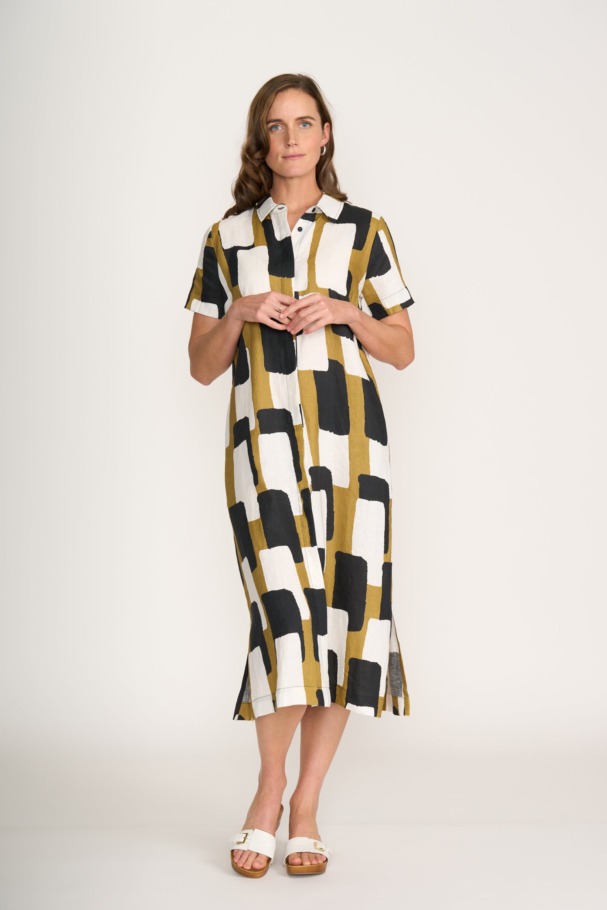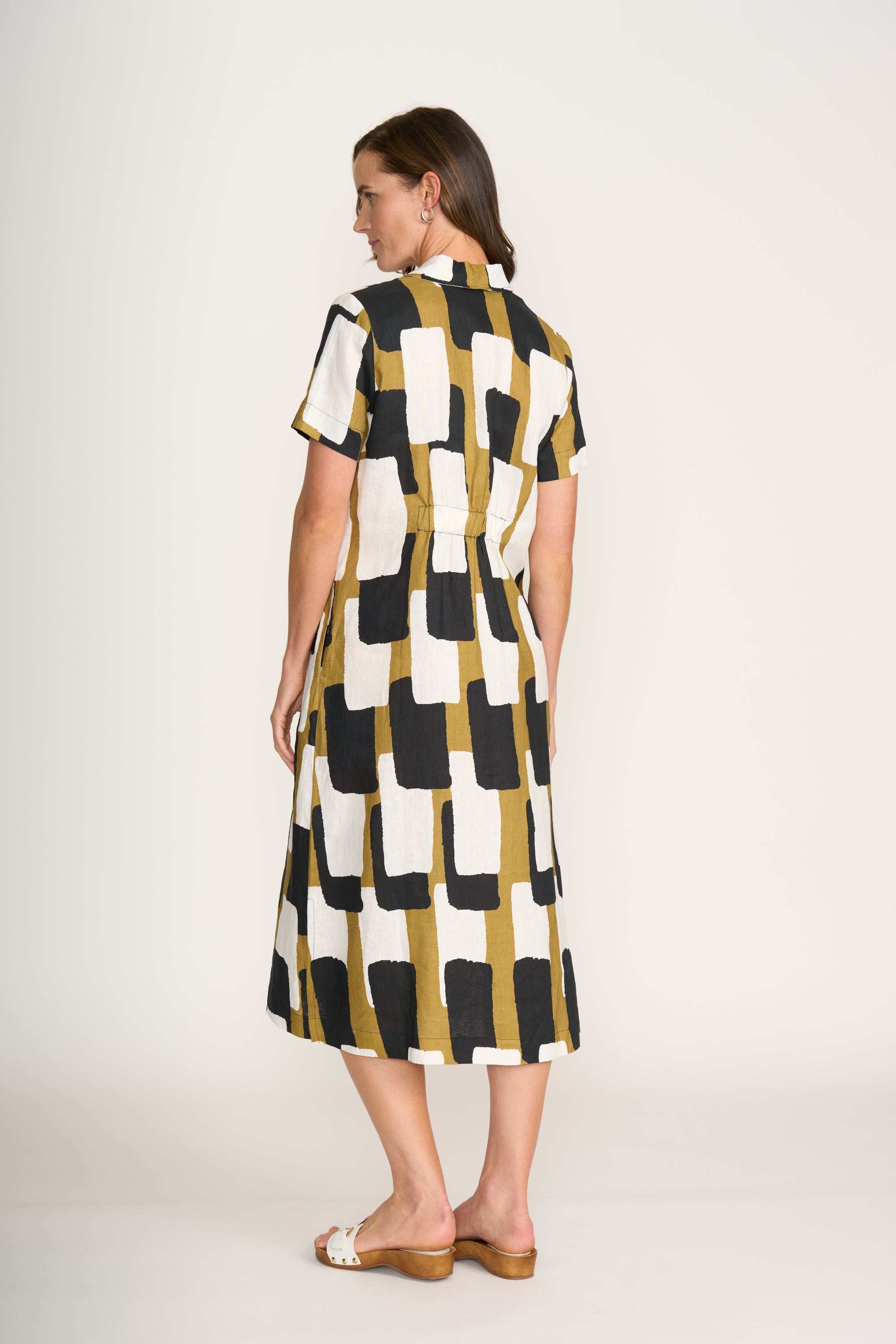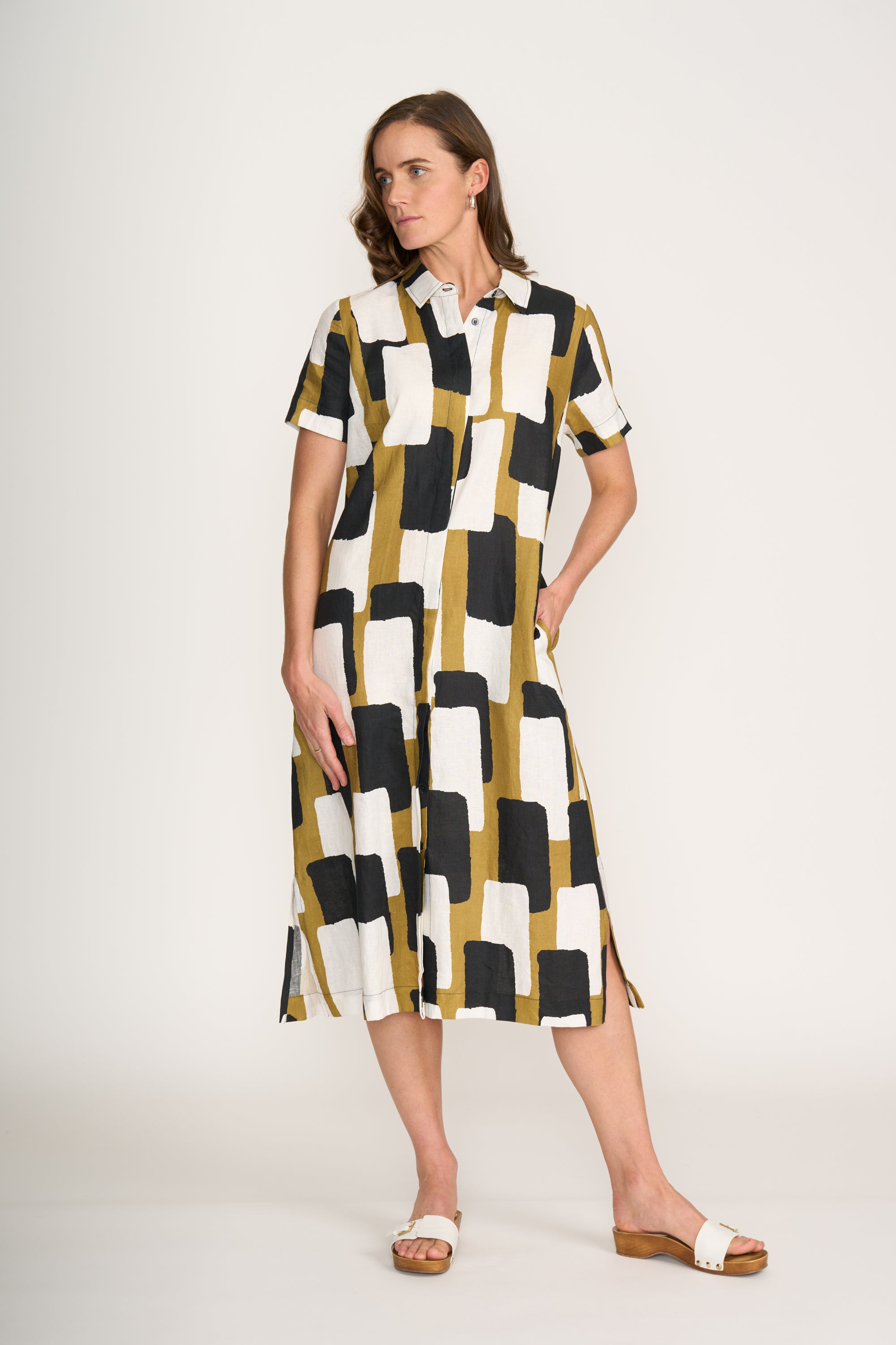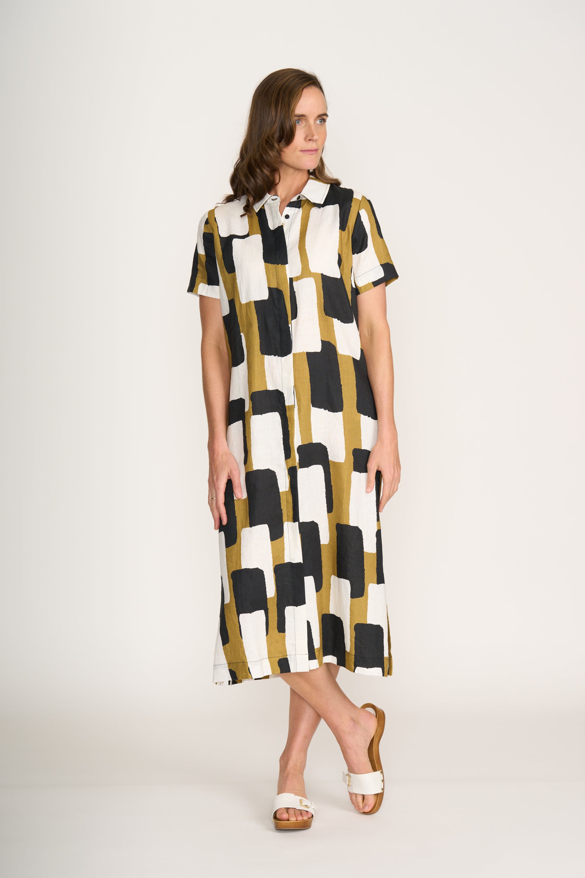 - Bold geometric “Art Box” print (black/ivory/ochre)