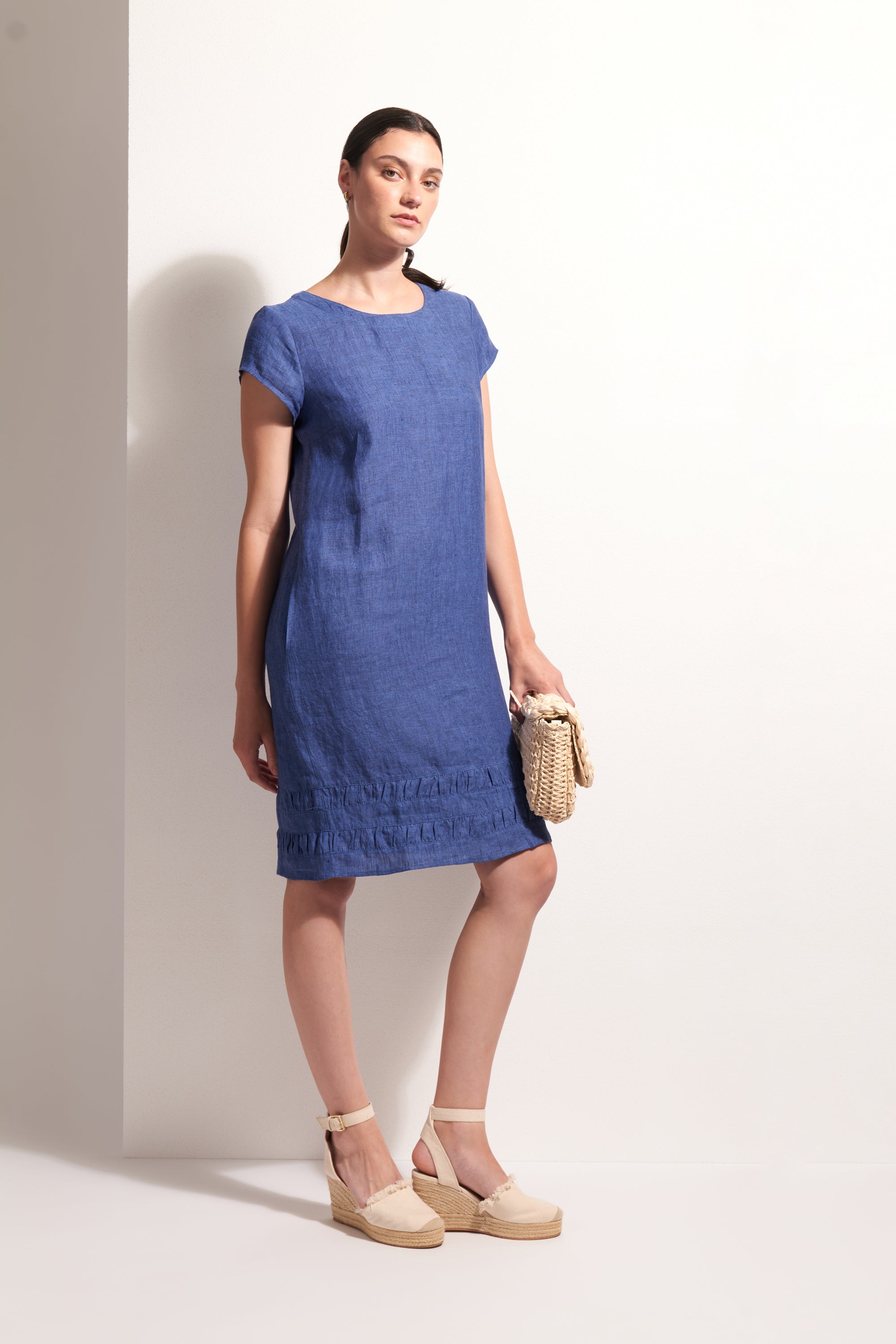 This effortless linen shift dress features a relaxed fit, soft cap sleeves, and gathered insert panel detail at the hem for subtle texture and movement. Cool, breathable, and endlessly easy to style.