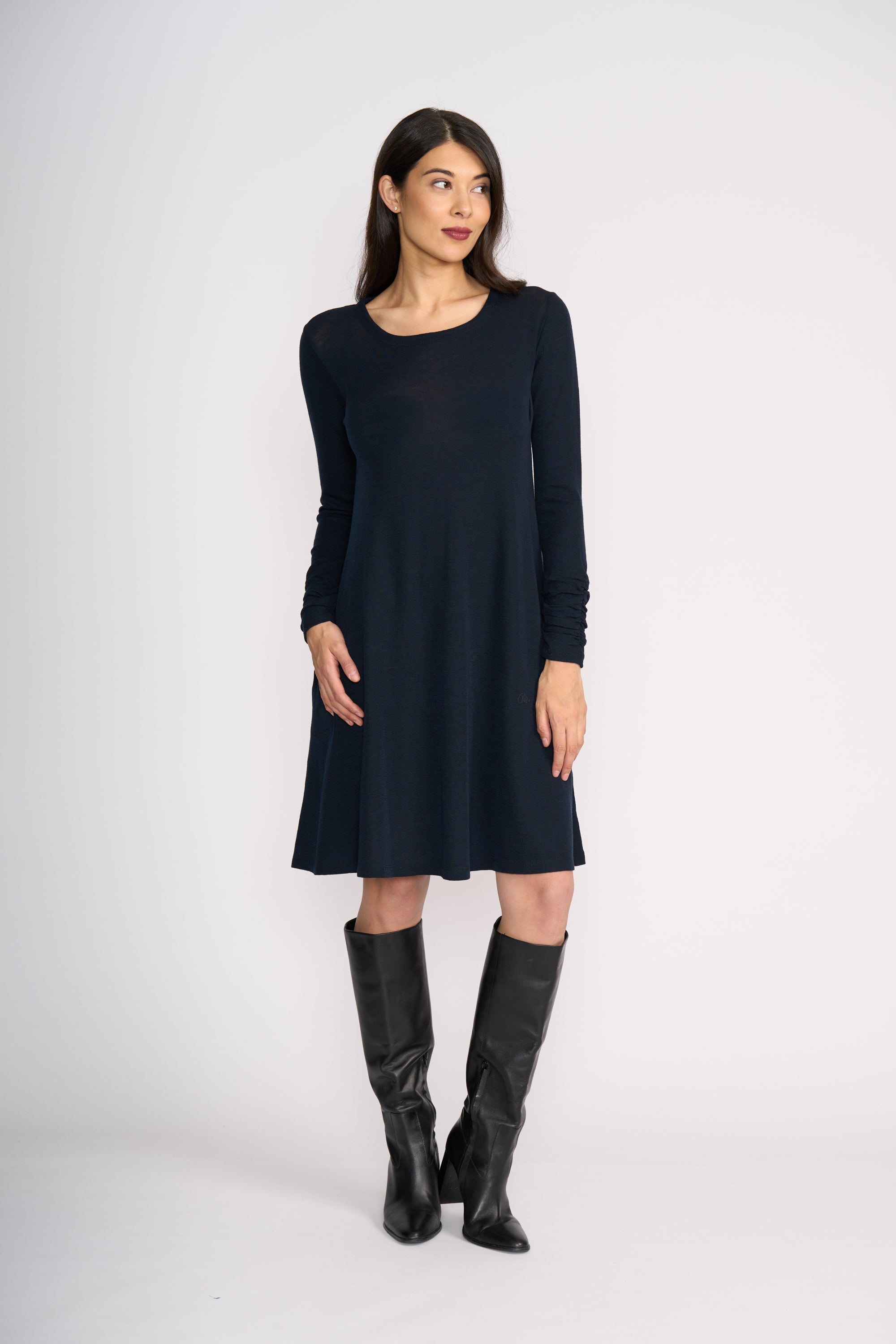 Easy, elegant and endlessly wearable — the Delightful Dress is crafted from soft 100% merino wool, offering lightweight warmth with a beautiful natural drape. Designed in a relaxed A-line silhouette, it skims the body without clinging, making it the perfect throw-on piece for everyday comfort and effortless style. Dress it up with boots or keep it casual — this is your go-to winter staple.