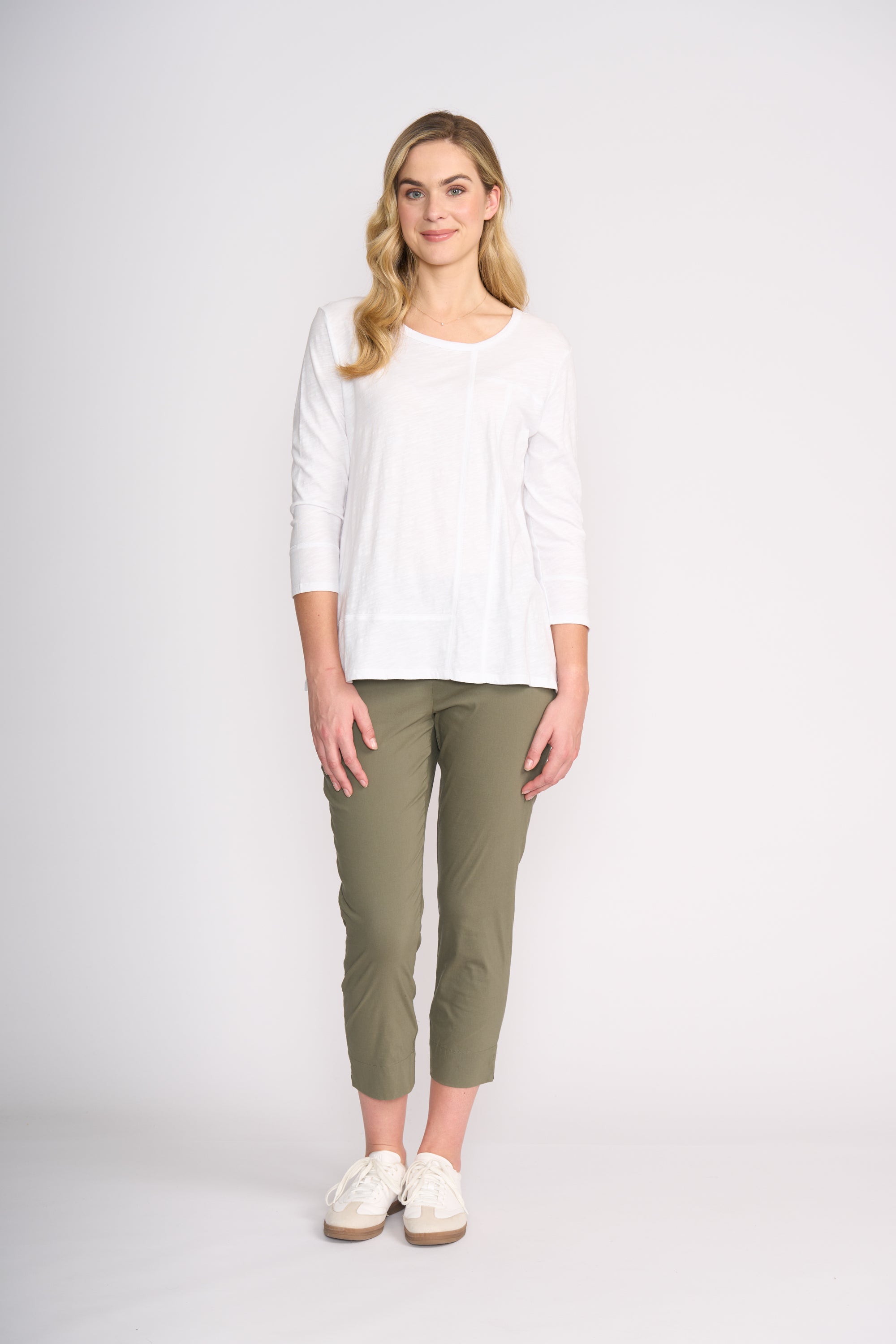 Embrace effortless style with the Fuss Free 7/8 Taper Capri by Foil, destined to be your wardrobe go to. These pull-on pants are crafted from a luxurious, lightweight stretch cotton blend that feels delicate and airy against your skin. Perfect for casual outings, their plain colours effortlessly complements tunics, kaftans, tees, and blouses alike, making them a versatile addition to your wardrobe. With a comfortable waistband and slim clean leg line. Wonderful to wear all day and slim enough to wear your longer line shirts and tops with.