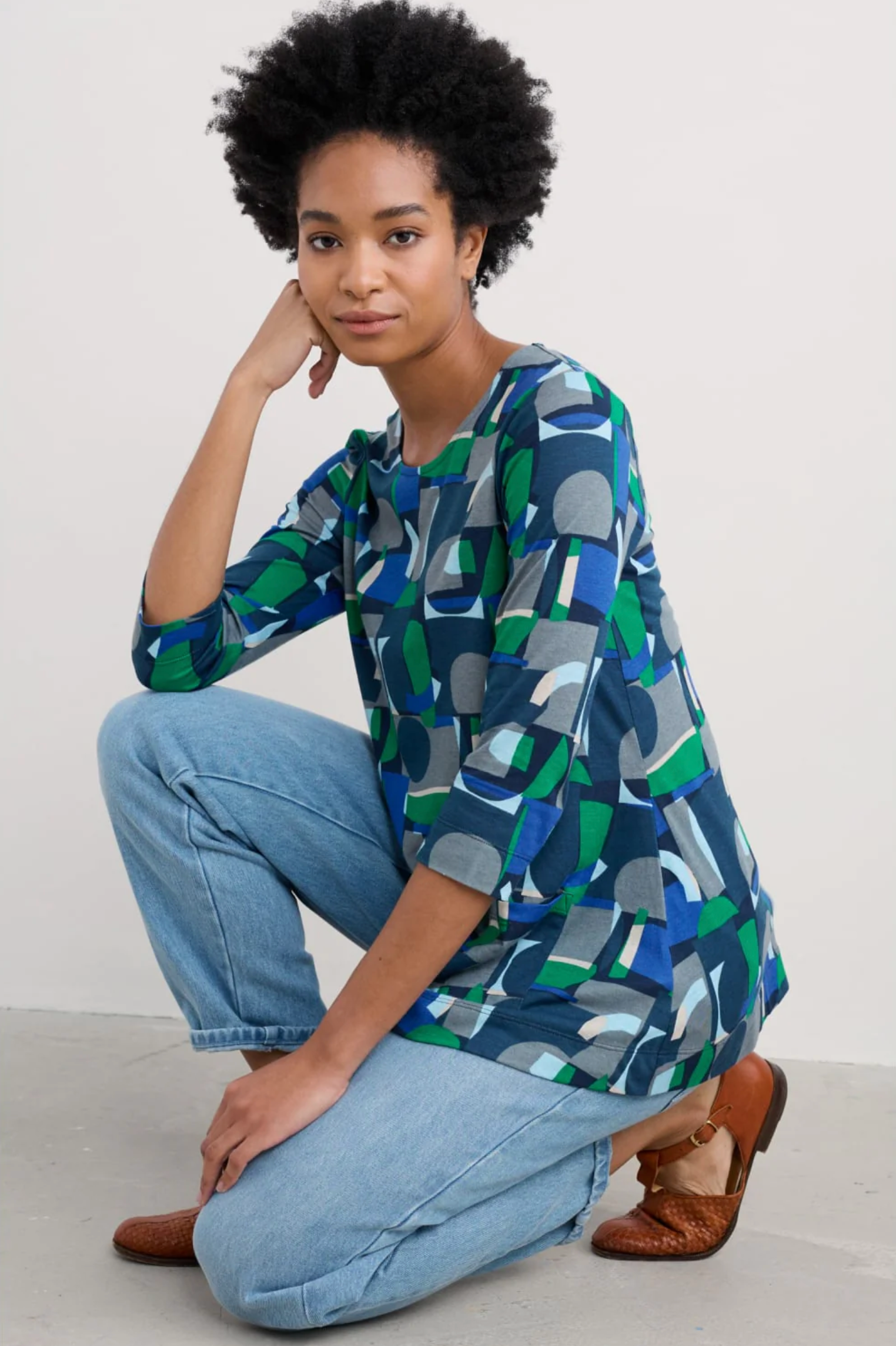 A top in a gorgeous, handcrafted print. It's made from a soft-against-the-skin, sustainable blend of organic cotton and TENCEL™ Modal for a silky drape and feel that complements the swing silhouette. Finished with a round neck, 3/4 length sleeves and handy little patch pockets. Perfect for everyday.