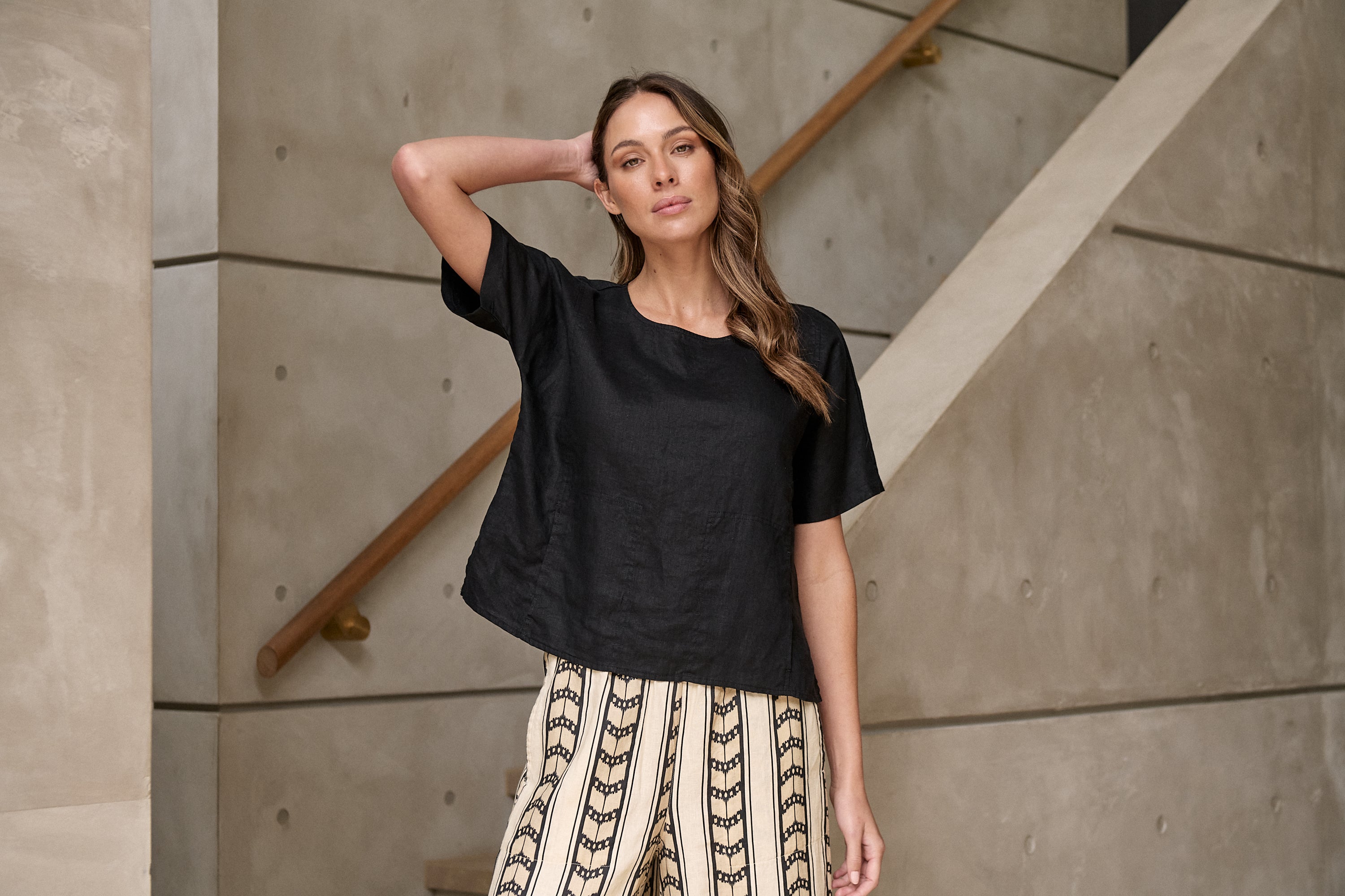 An effortless linen tee with a relaxed, boxy drape that skims (never clings). It’s finished with a clean round neck, front patch pockets, easy short sleeves and a straight hem with small side splits for movement. A centre-back seam adds subtle shape. Throw it on with crops, denim or skirts—Bamboo colour goes with everything.