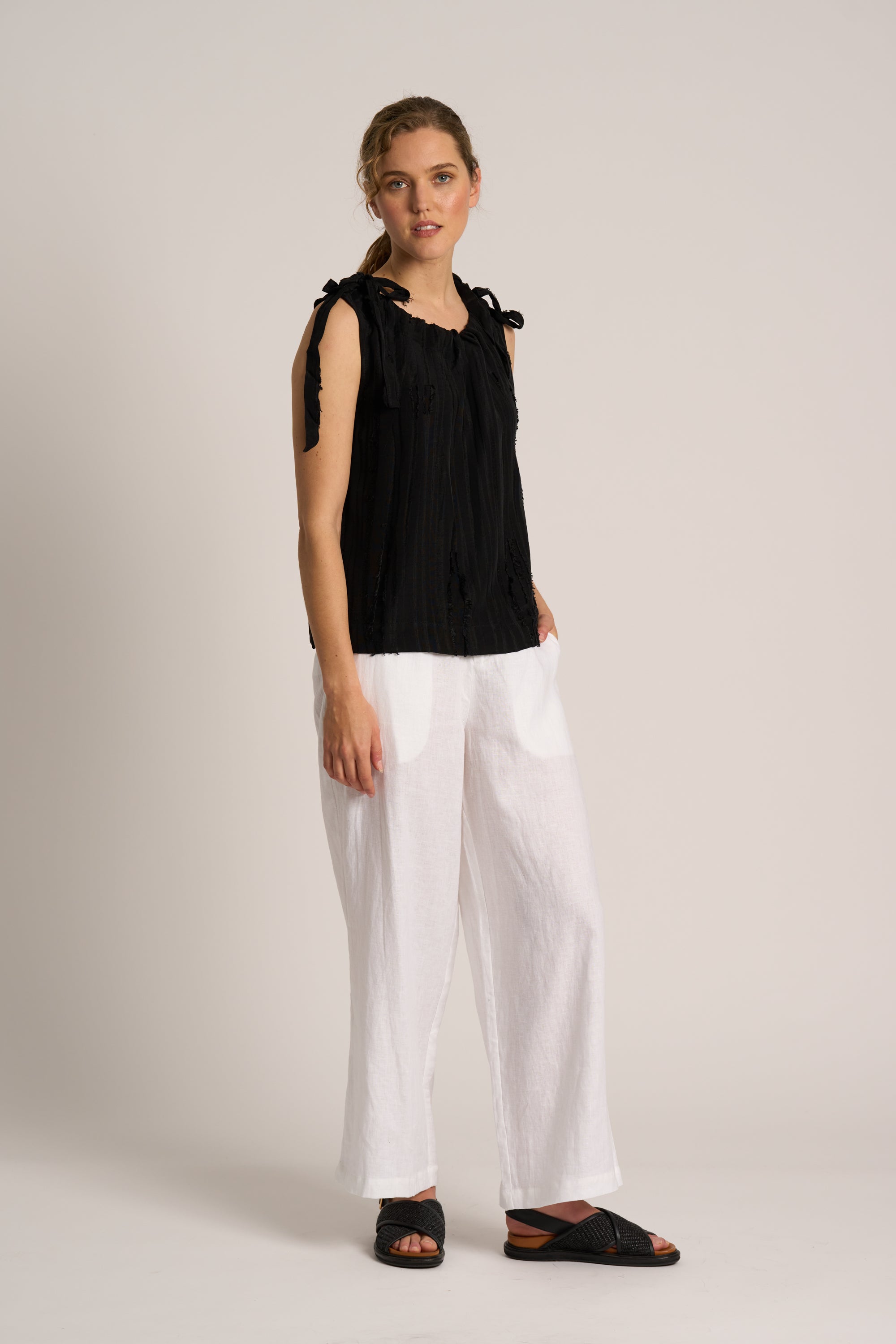A light, airy shell with a pretty adjustable neck and shoulder‐tie detail. Cut from textured, self-stripe tencel mix non stretch fabric, the gathered neckline and gentle ruffle trim give this piece softness and a touch of romance, while the straight hem keeps it effortless for everyday wear.
