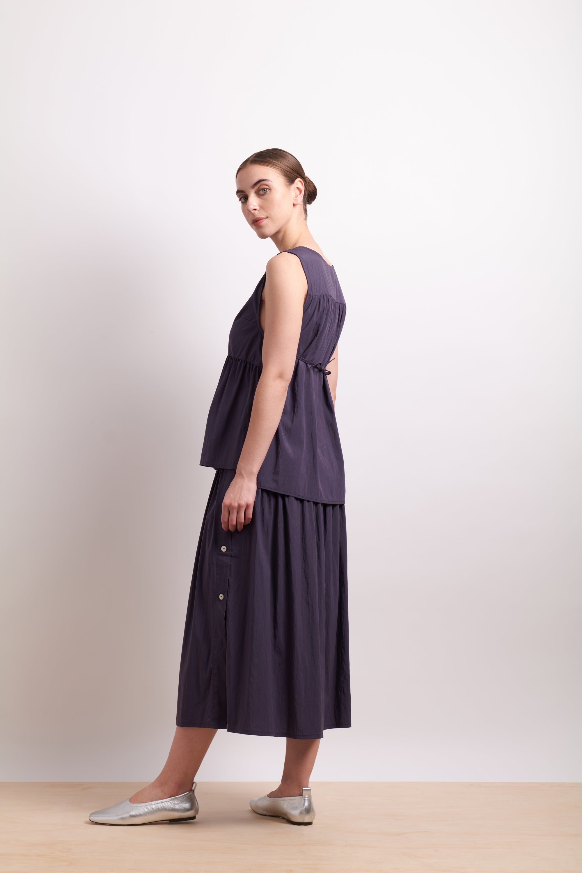 A softly-structured sleeveless top designed to skim and shape. Cut from a lightweight woven with fabric, it sits neatly through the shoulders, then falls to a gentle, tiered peplum. An adjustable self-ties at the sides lets you “tie the knot” to your shape. Finished with a clean round neck and a short concealed placket, it’s an effortless piece that dresses up or down. Wear with matching Tie The Knot Skirt.