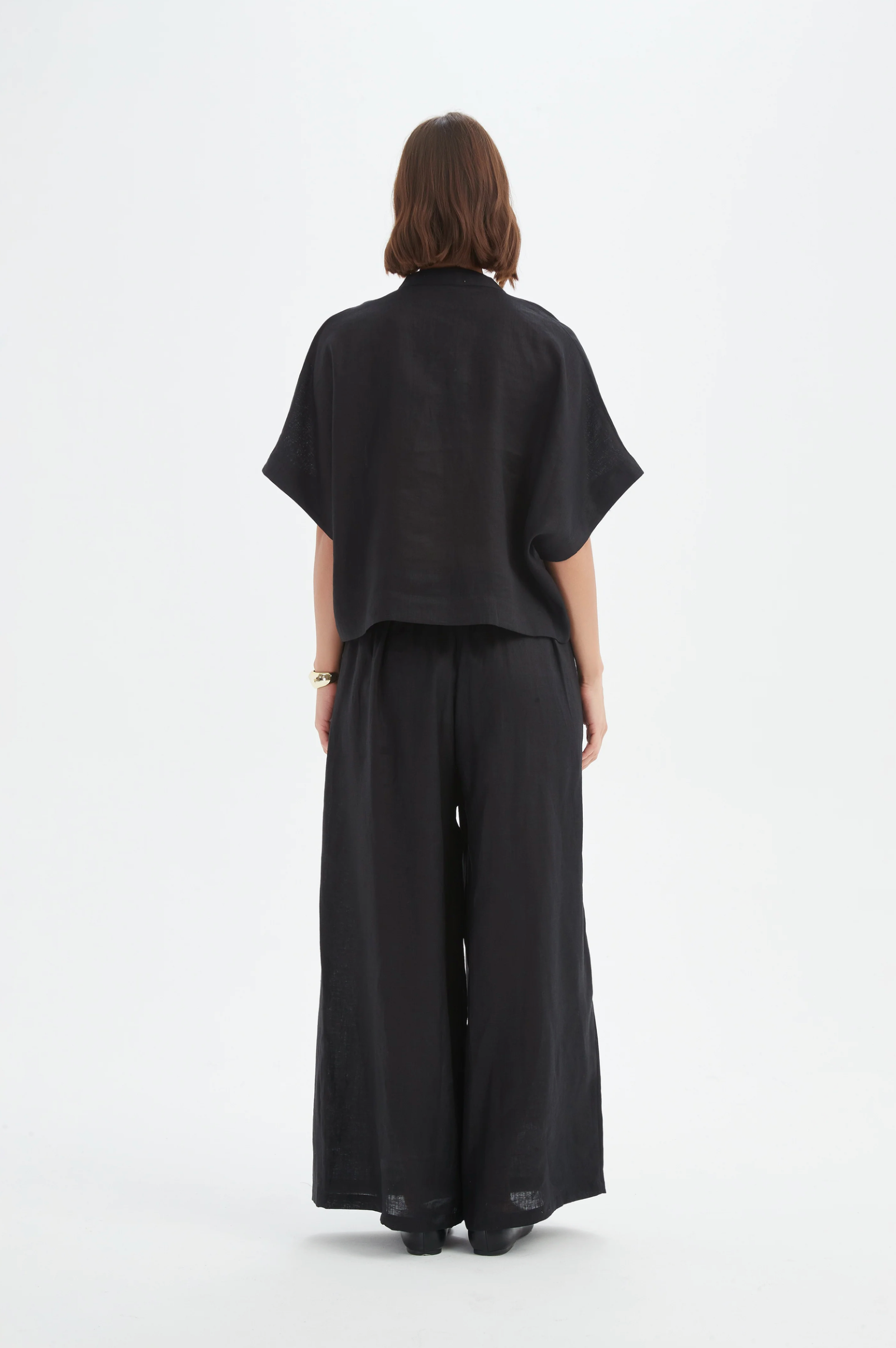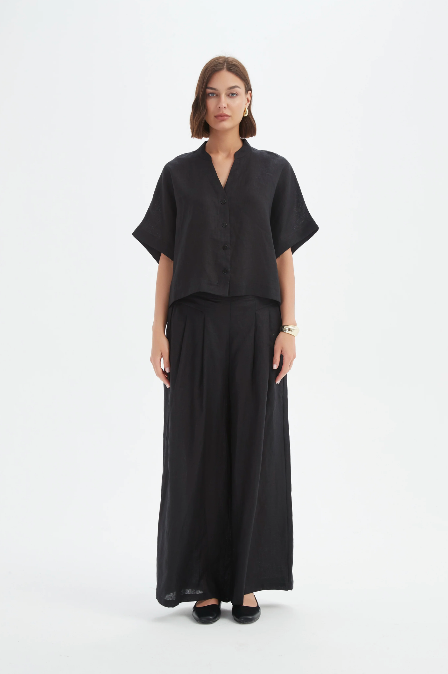Meet your new throw-on-and-go linen shirt. The Boxy Button Linen Shirt brings an easy, modern shape with a V neckline and wide short sleeves for that relaxed, cool-girl drape. Slightly cropped to sit just right with high-waisted and wide leg bottoms, it’s effortless worn buttoned up or tossed on open over a tank. Pure French linen keeps it breezy from desk to dinner.