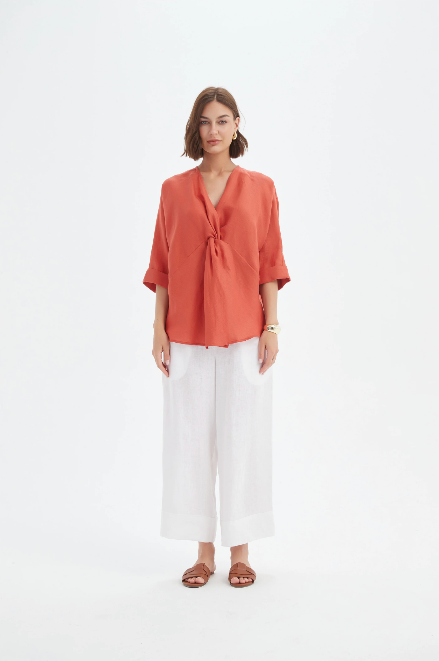 A linen top with instant shape. The Twist Front Top is cut from pure French linen with a flattering V-neck, easy 3/4 sleeves and a soft front twist that creates drape through the waist. Relaxed but refined, it pairs back with tailored pants, skirts or denim for effortless, sun-ready style.