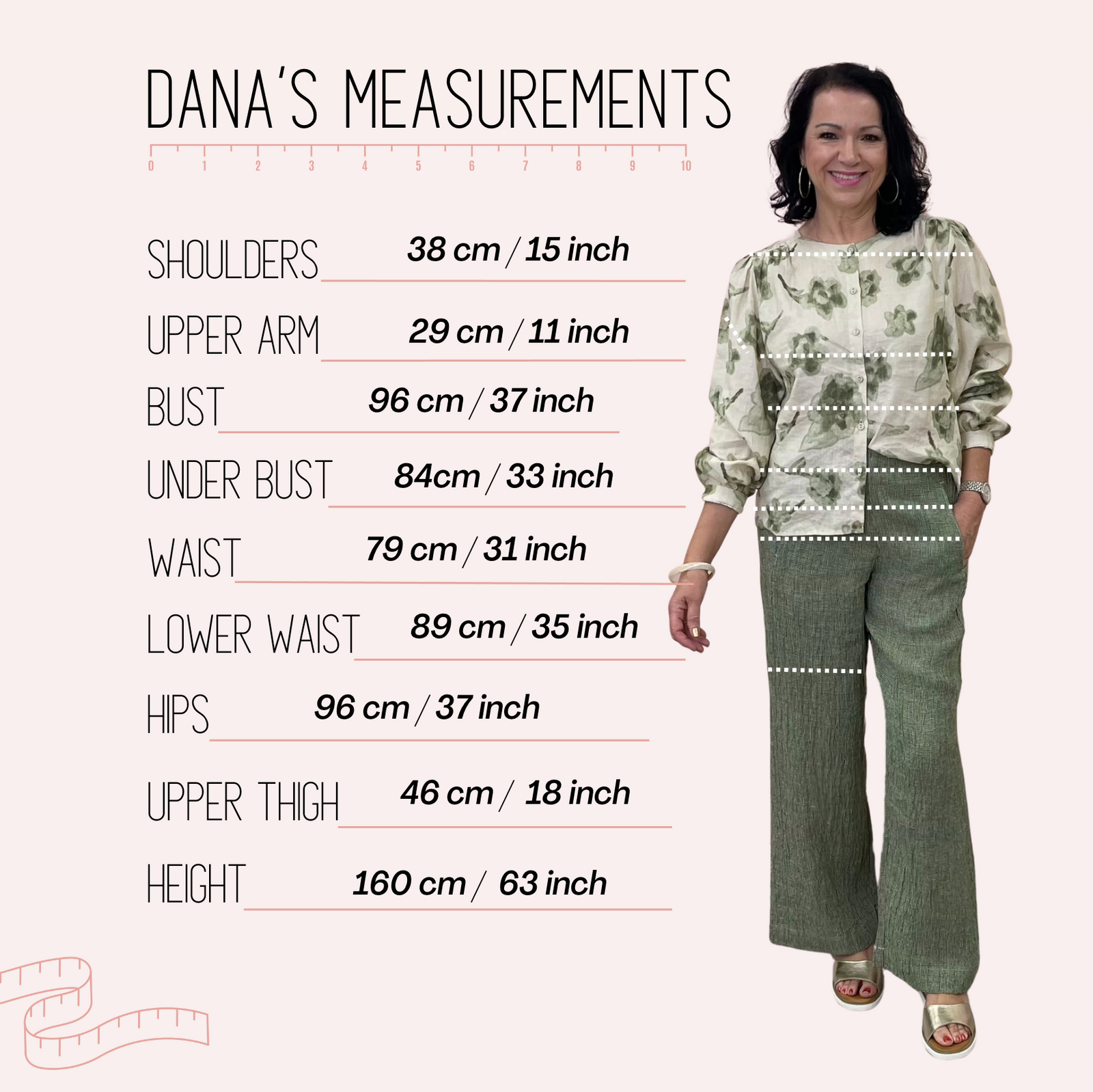 Dee usually wears an M or 12 top and 12 bottoms in brands such as Tani and Foil. She is a "rectangle" body shape. Dee is also 166cm/ 65.3 inch.